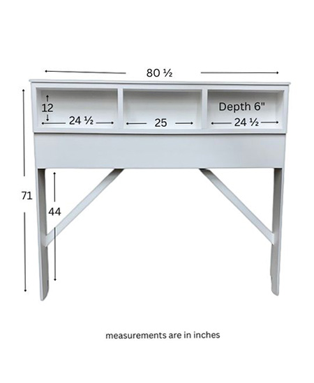The dimensions are: 80″ wide, 71″ high, shelves are 12″ high and 6″ deep. The top ledge is 80 1/2″ x 6 1/2″.