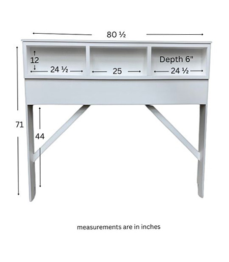 The dimensions are: 80″ wide, 71″ high, shelves are 12″ high and 6″ deep. The top ledge is 80 1/2″ x 6 1/2″.